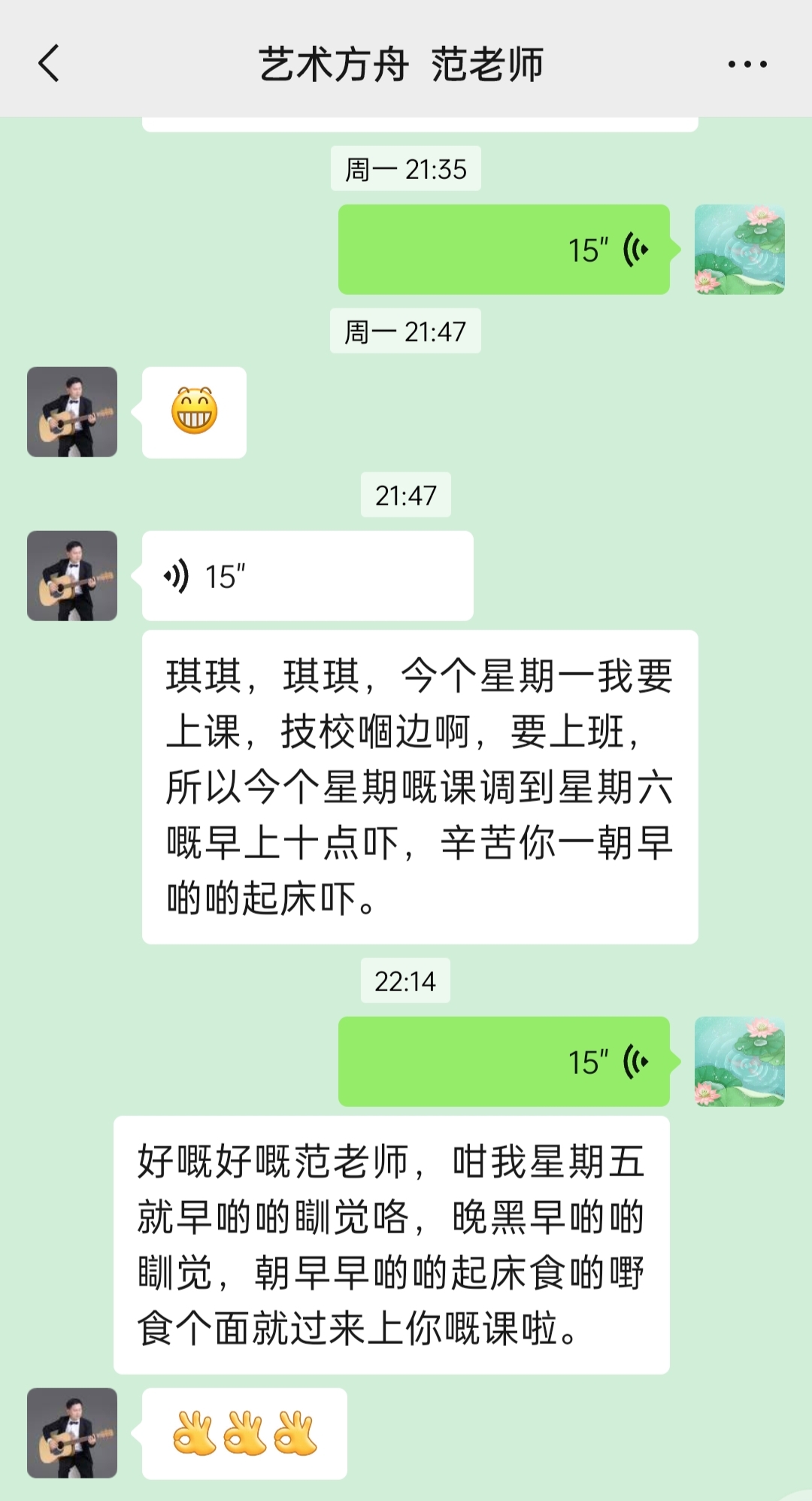 他说星期天学校要上课,让我星期六早上十点去琴行上音乐课