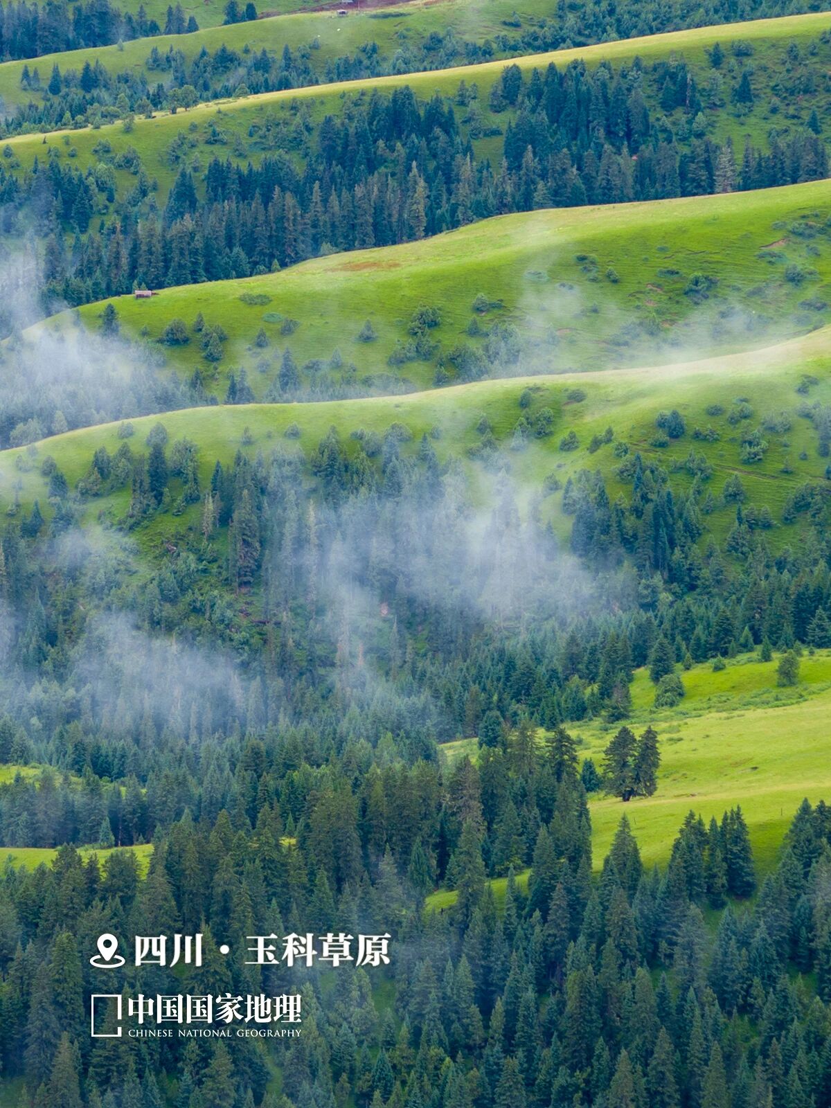 ⑦玉科草原位于四川省甘孜藏族自治州道孚县,也被称为“康巴阿勒泰”。此处有独特的“立体”景观,站在谷底就可以将草原、森林、湖泊、高山尽收眼底。