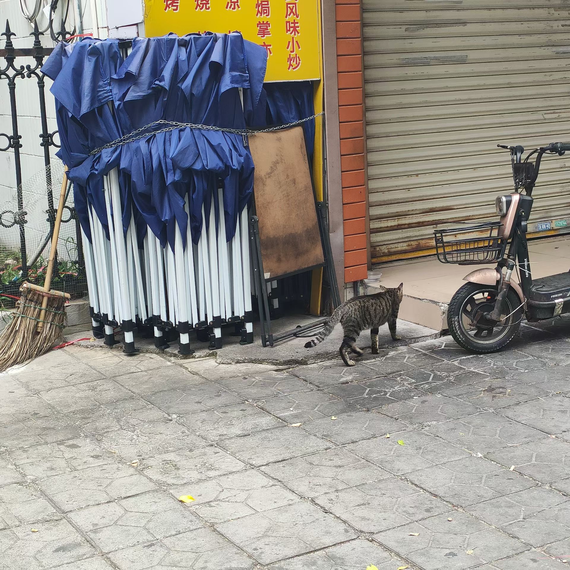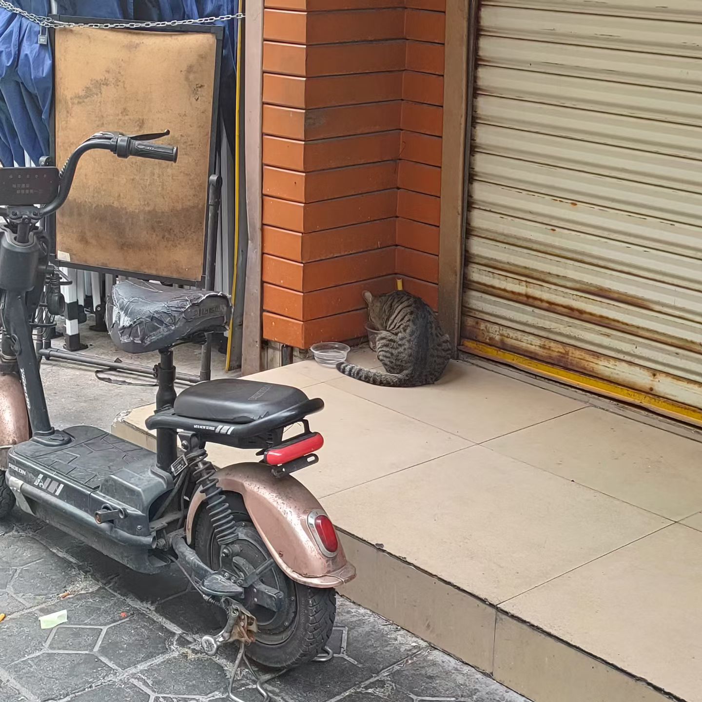 饭店门口放着一碗吃的,还有一碗水。原本想看看里面装了啥吃的,但没敢靠得太近,怕吓跑了小猫。不过看这颜色,应该是猫粮。