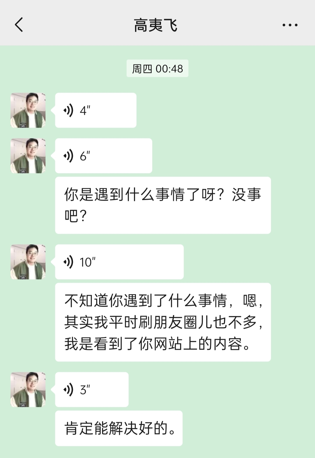 昨晚十一点多,站长给我发来三句语音。当我听到他这样跟我说的时候,我的内心被触动了一下,感到特别暖心。