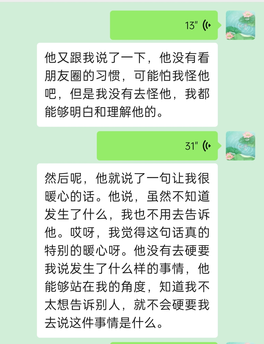 因为今次发生的这件事情比较严重,我确实不太愿意跟朋友们去说。他没有硬要我去说发生了什么事情,而是选择站在我的角度,跟我说“虽然说不知道你发生了什么,你也不用告诉我”,哇,我的天!他真的挺好的,他真的有体谅我和理解我啊!