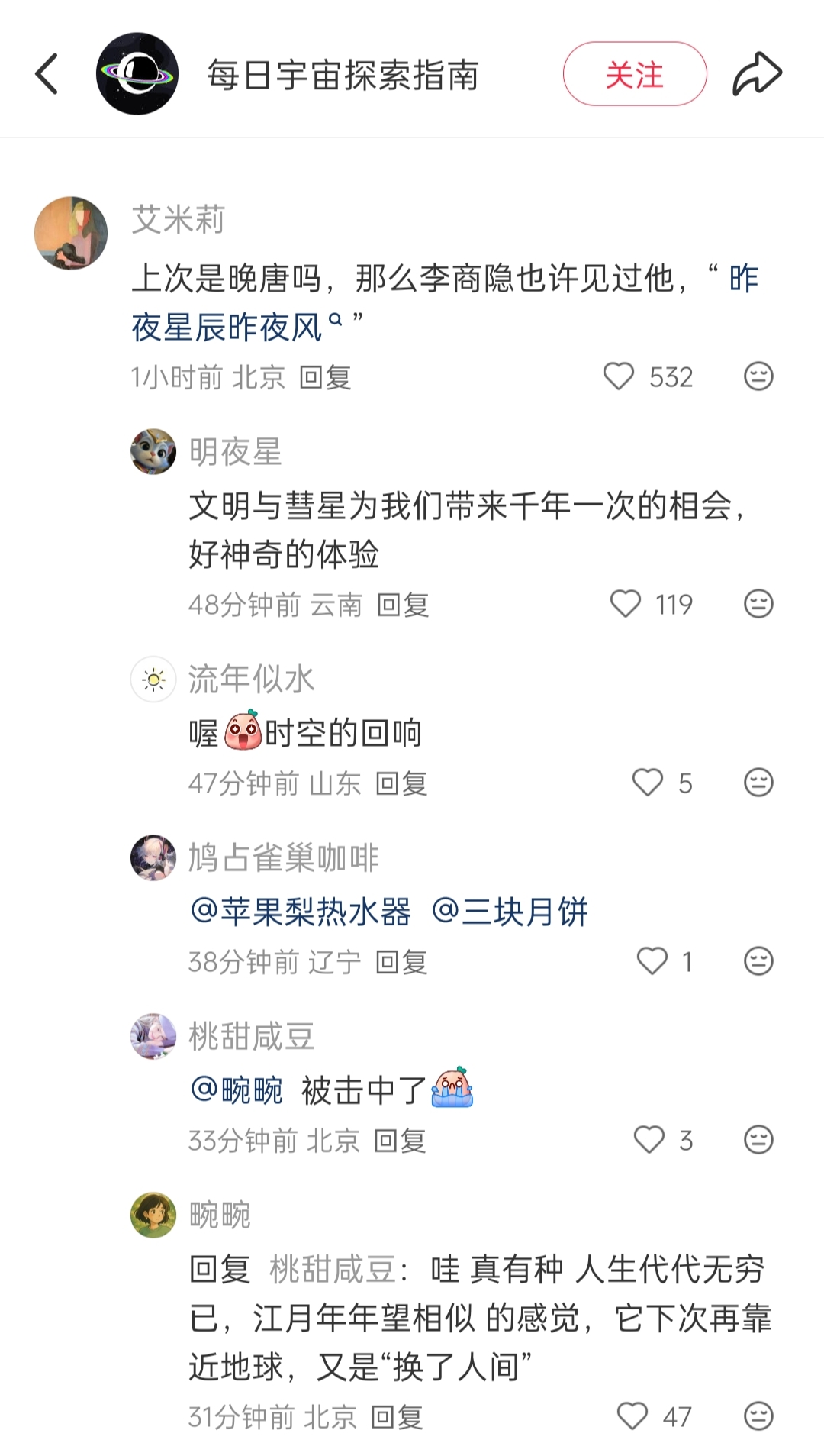 “文明与彗星为我们带来千年一次的相会,好神奇的体验。”