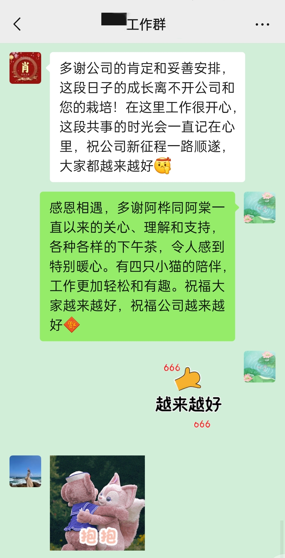 我会把这段时间的相处都放在我的“人生回忆收藏夹”里,日后也会跟我的老公、我的孩子、我的伙伴和我的新朋友们谈起这家公司、这里的人、这里的小猫,以及在这里发生的故事,比如说巧姐、巧姐的女儿、亲戚、我们以前的好同事娟姐 妮姐 诗诗。