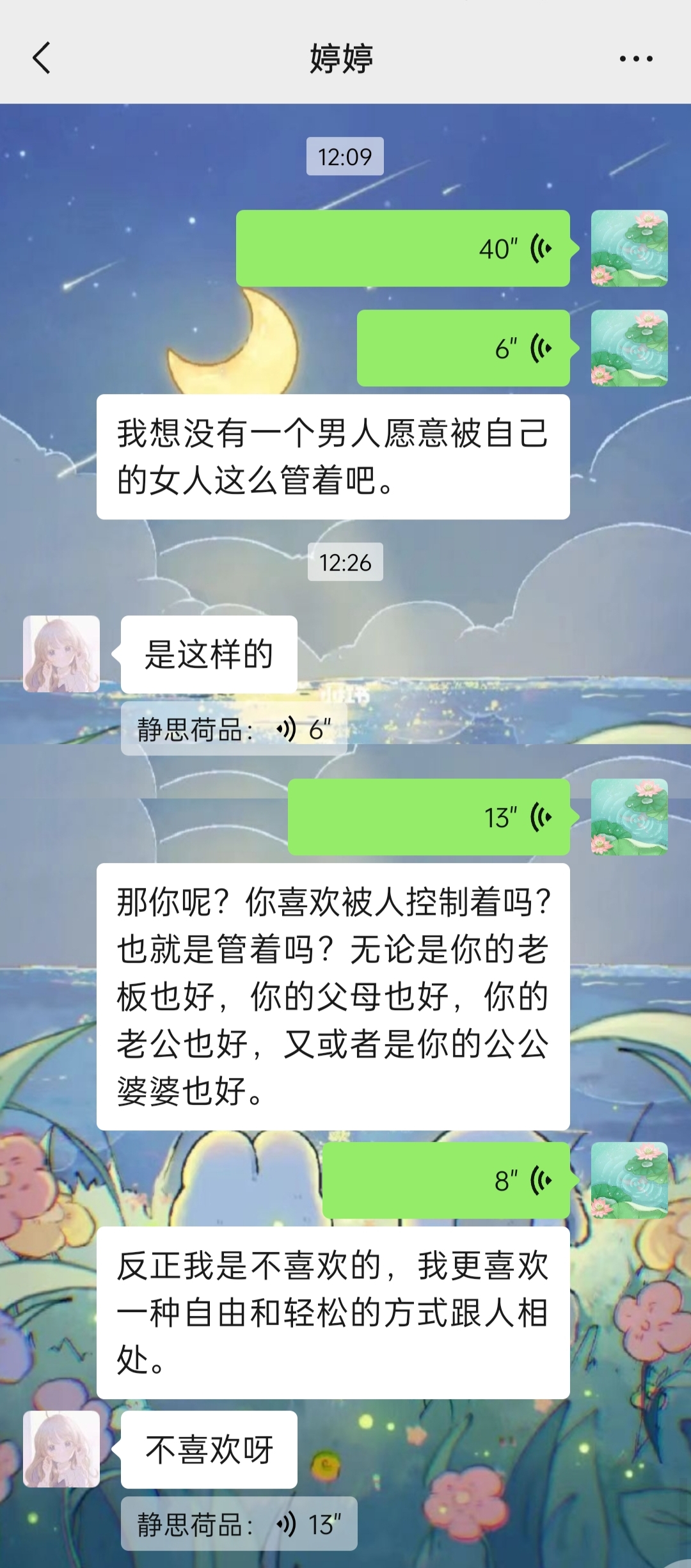 我又跟婷婷说,你喜欢被人管着吗?无论是你的老板、你的父母,还是你的老公、你的公公婆婆
