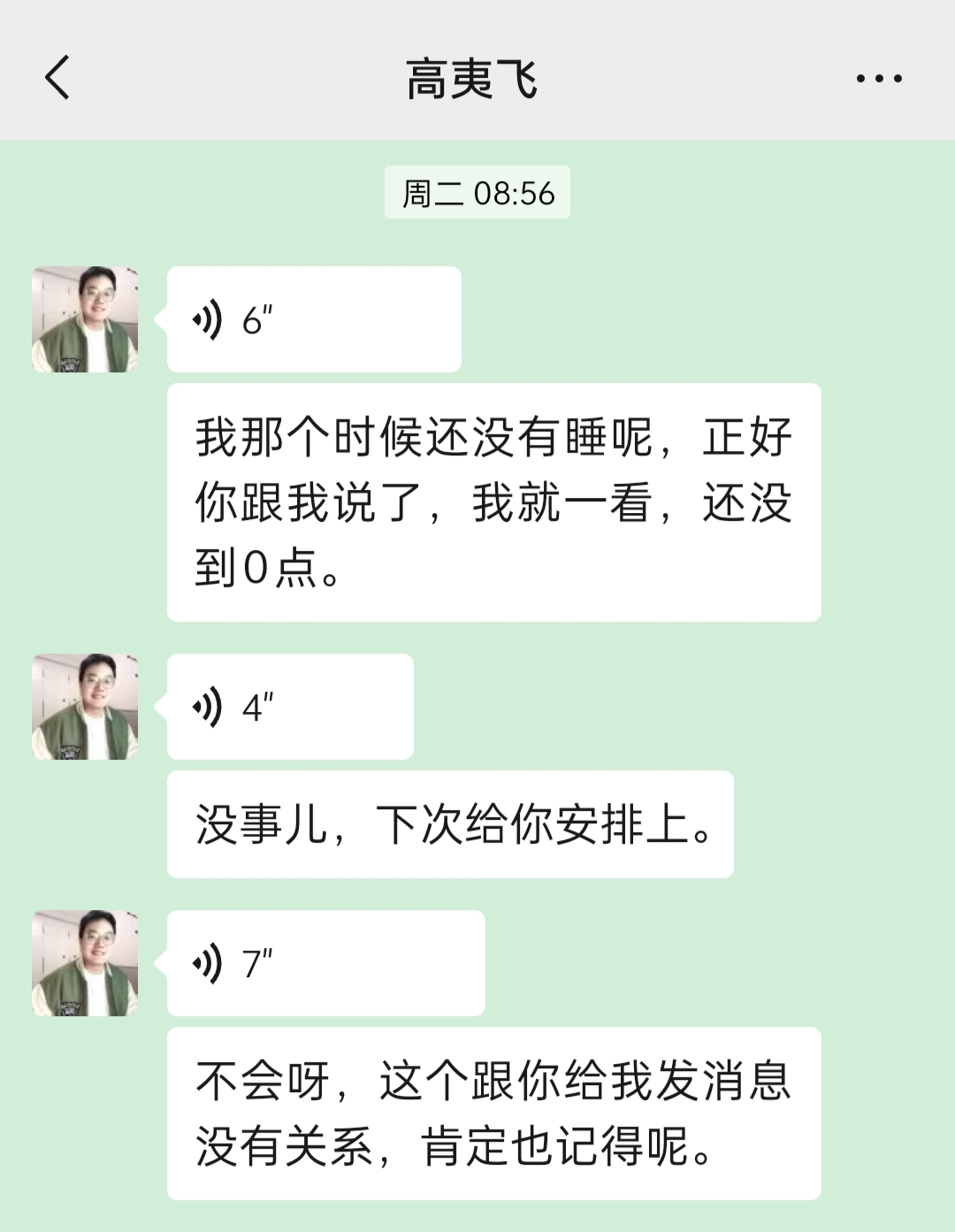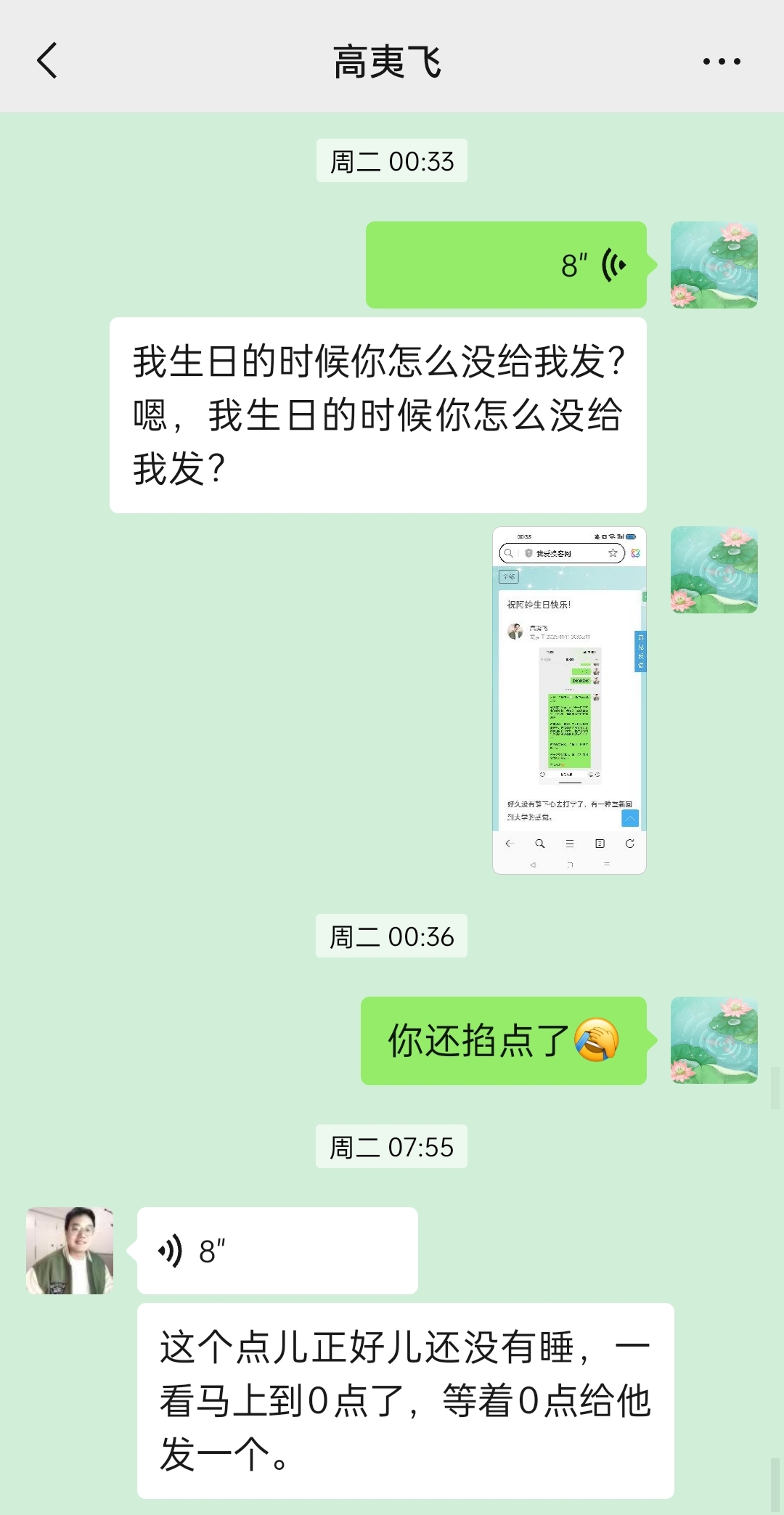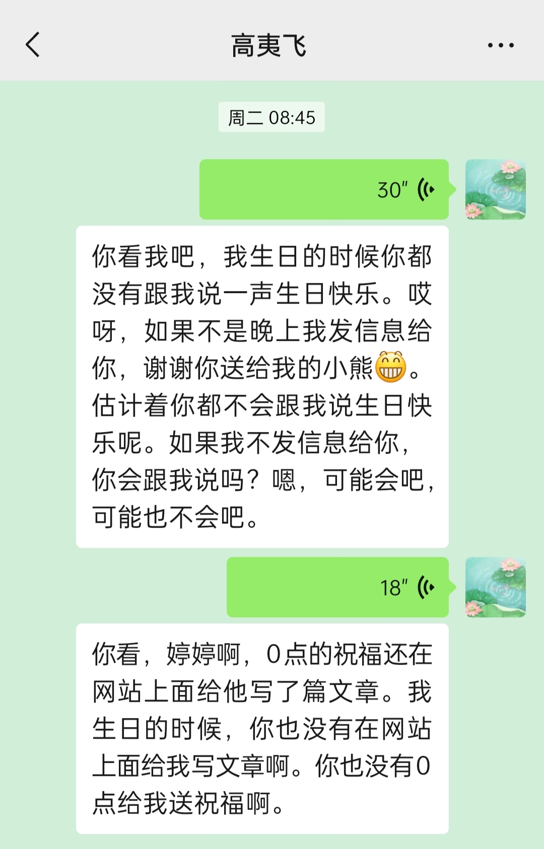我看到站长写的文章之后,没忍住就发了句语音给他,“嚯,我生日的时候你怎么没给我发?嗯,我生日的时候你怎么没给我发?”