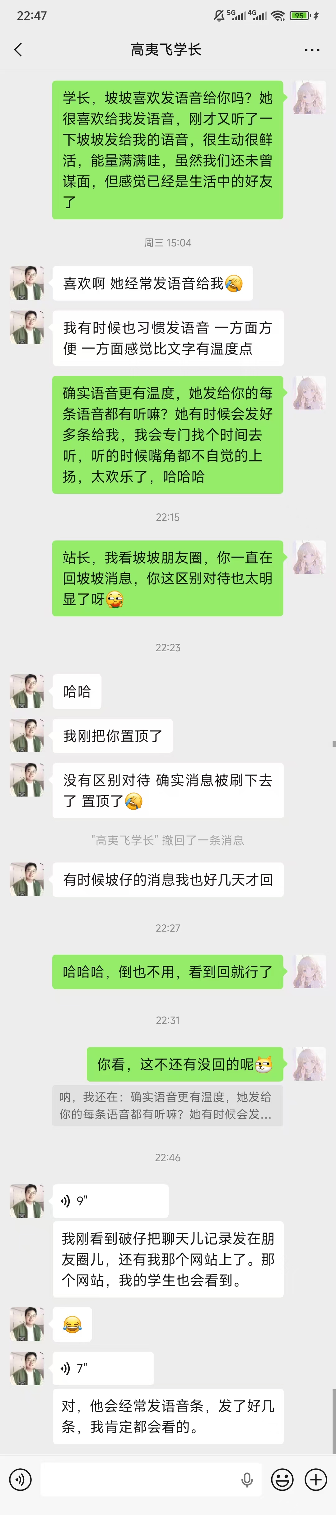 看了婷婷和站长的聊天记录,婷婷的话好多,叽叽喳喳的说个不停,像只小鸟一样。她吐槽站长,“啧”站长的时候,我觉得她真的好可爱啊,哈哈哈哈哈哈哈哈,太可爱了,我的天!!