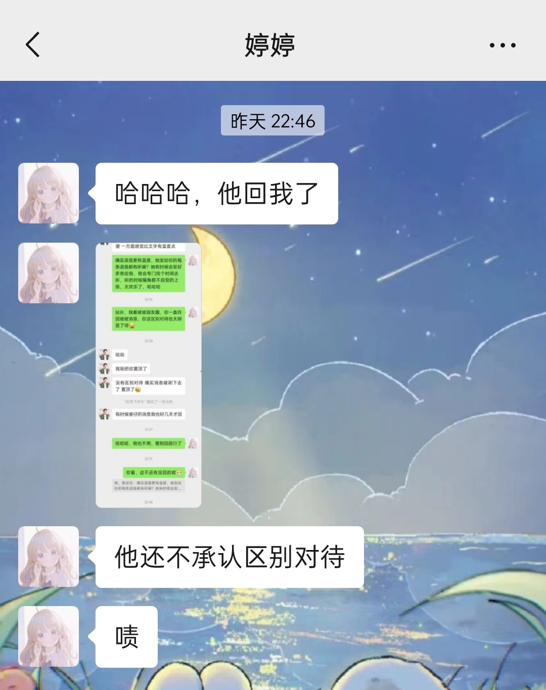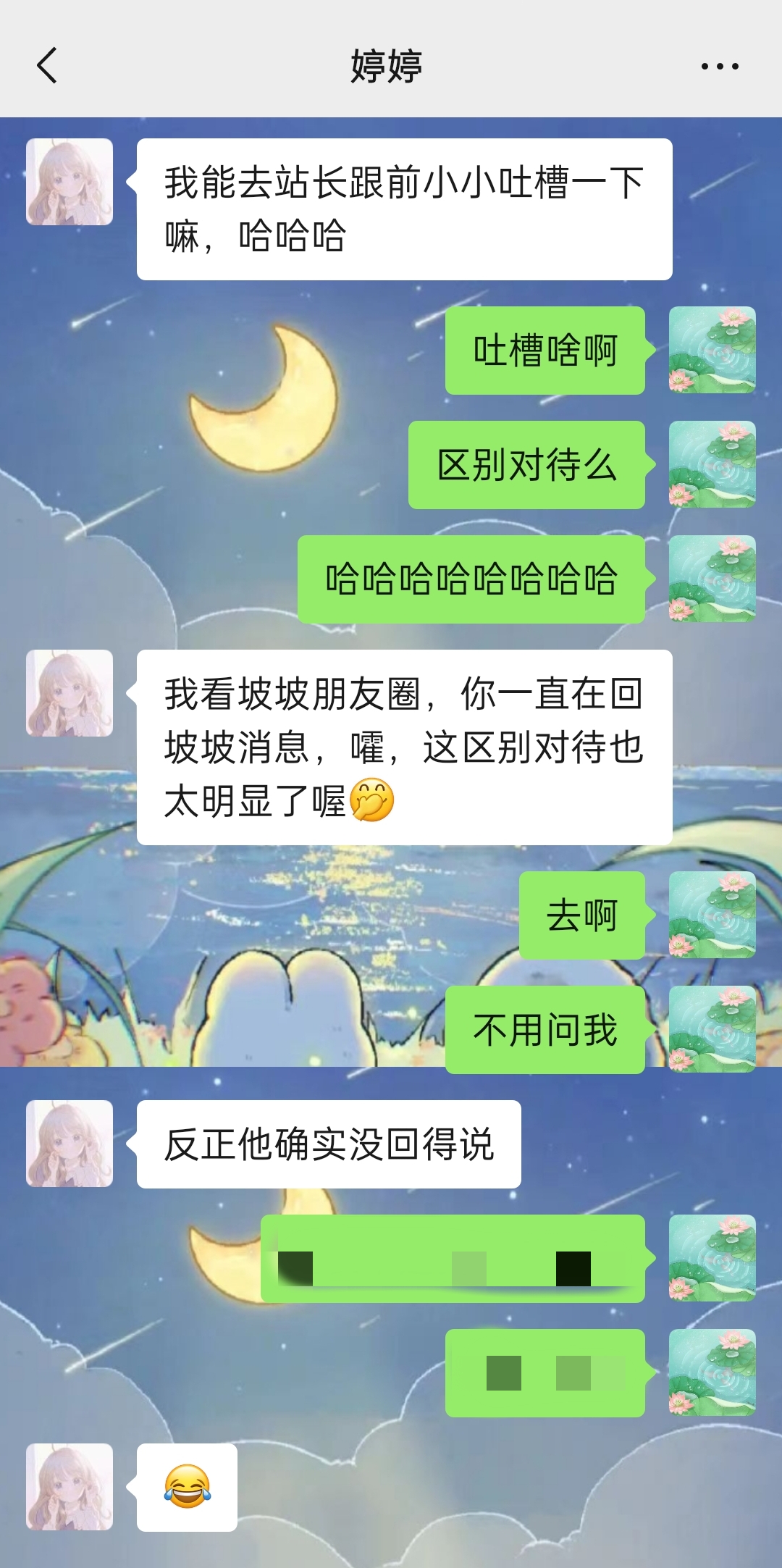 我的天,哈哈哈哈哈哈哈,婷婷说,站长终于回我了,他还不承认区别对待,啧(我的妈耶,她“啧”了站长,哈哈哈哈哈哈,笑死我了!)