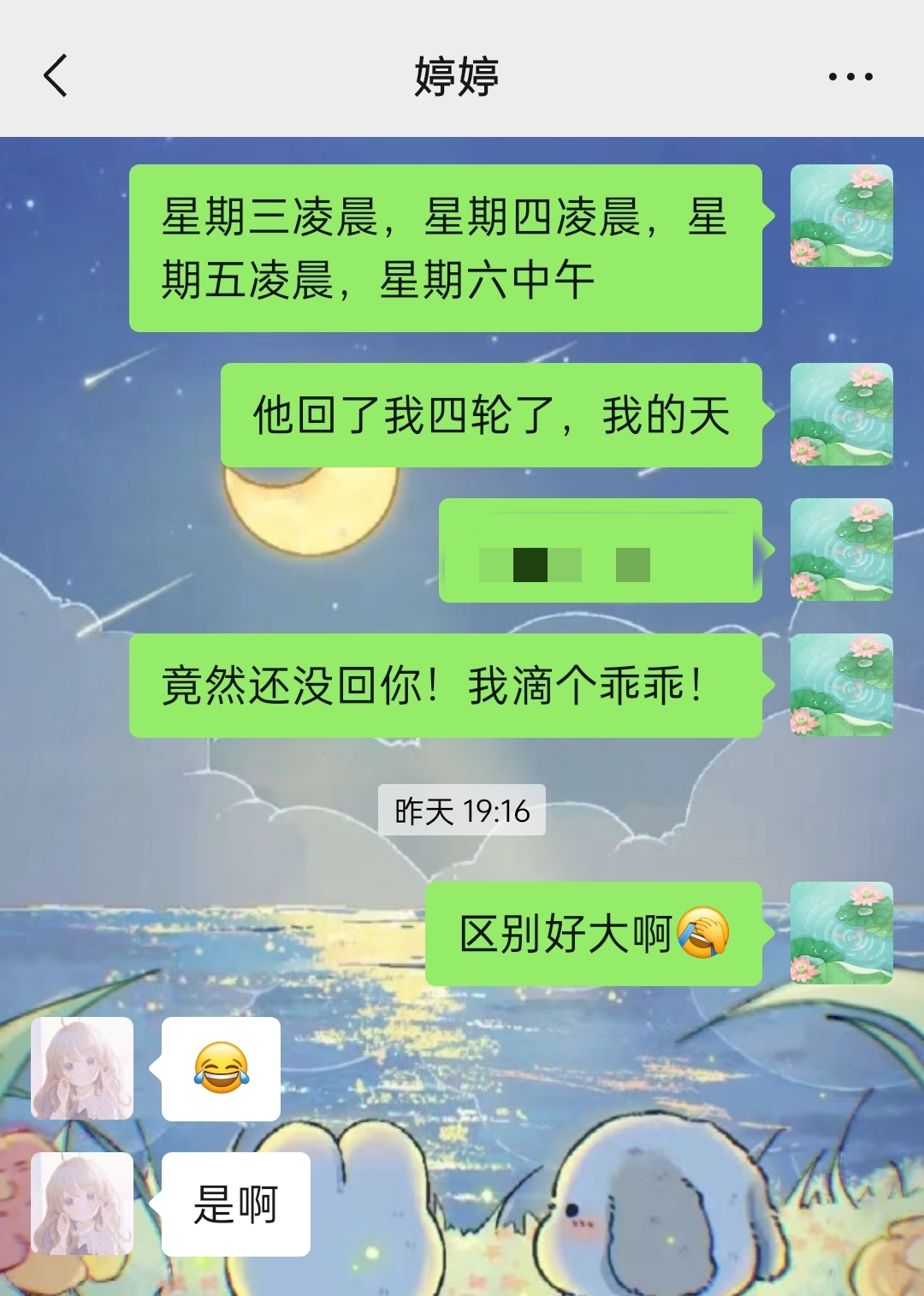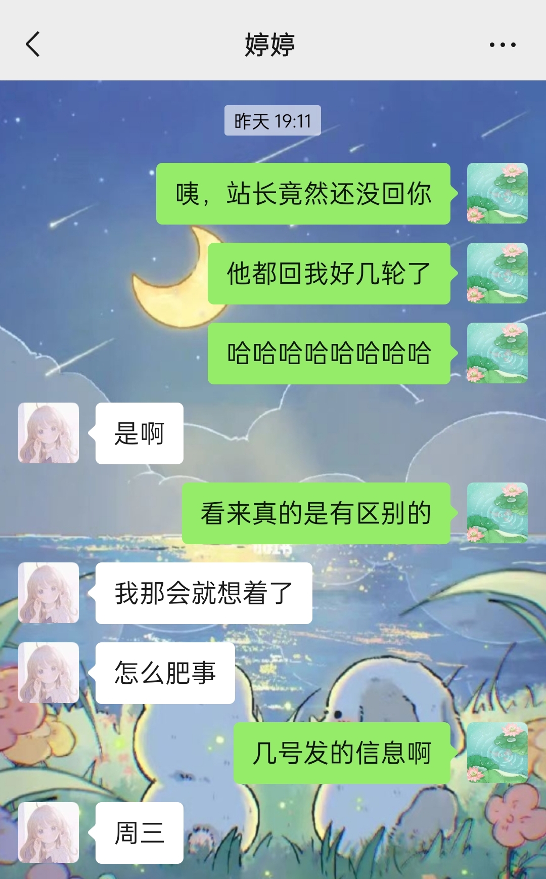 昨晚我问婷婷,站长还没回你信息嘛?他都回了我四轮了,竟然还没回你?