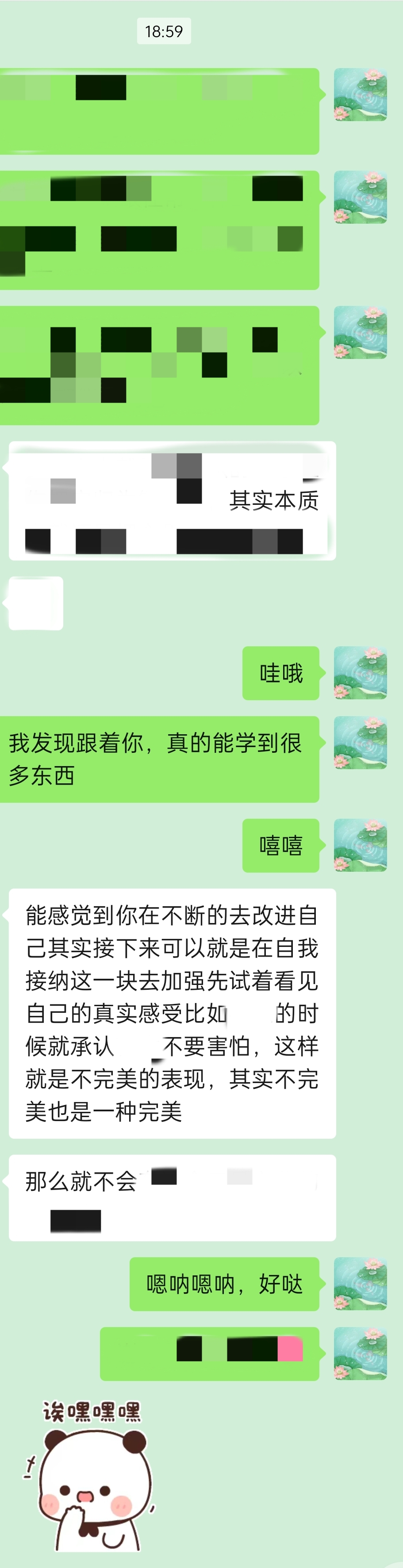 她说,我在逃避自己真实的感受,并没有去承认这种感受。她还感受到了我内心的害怕,正是因为内心的害怕,所以才去逃避。