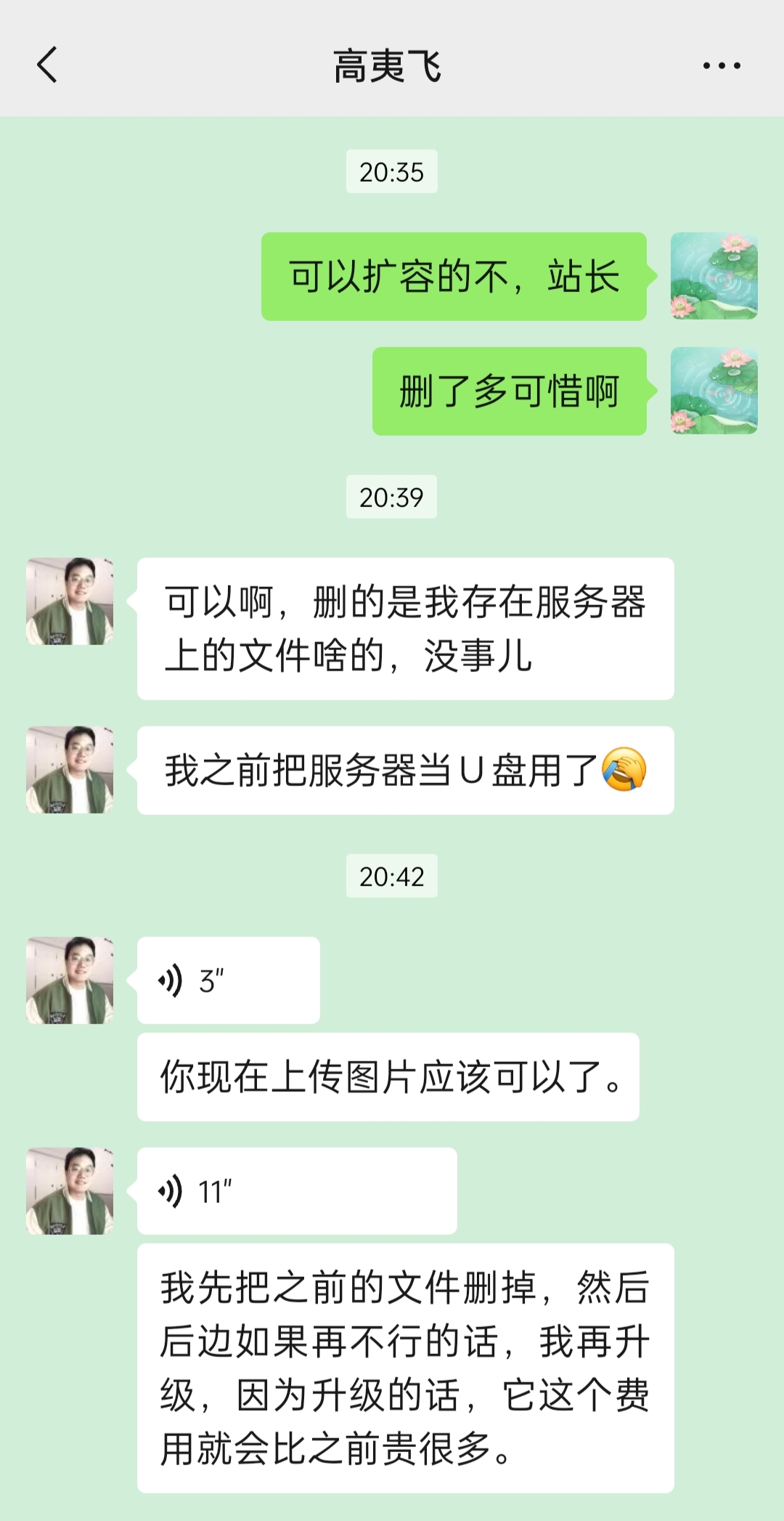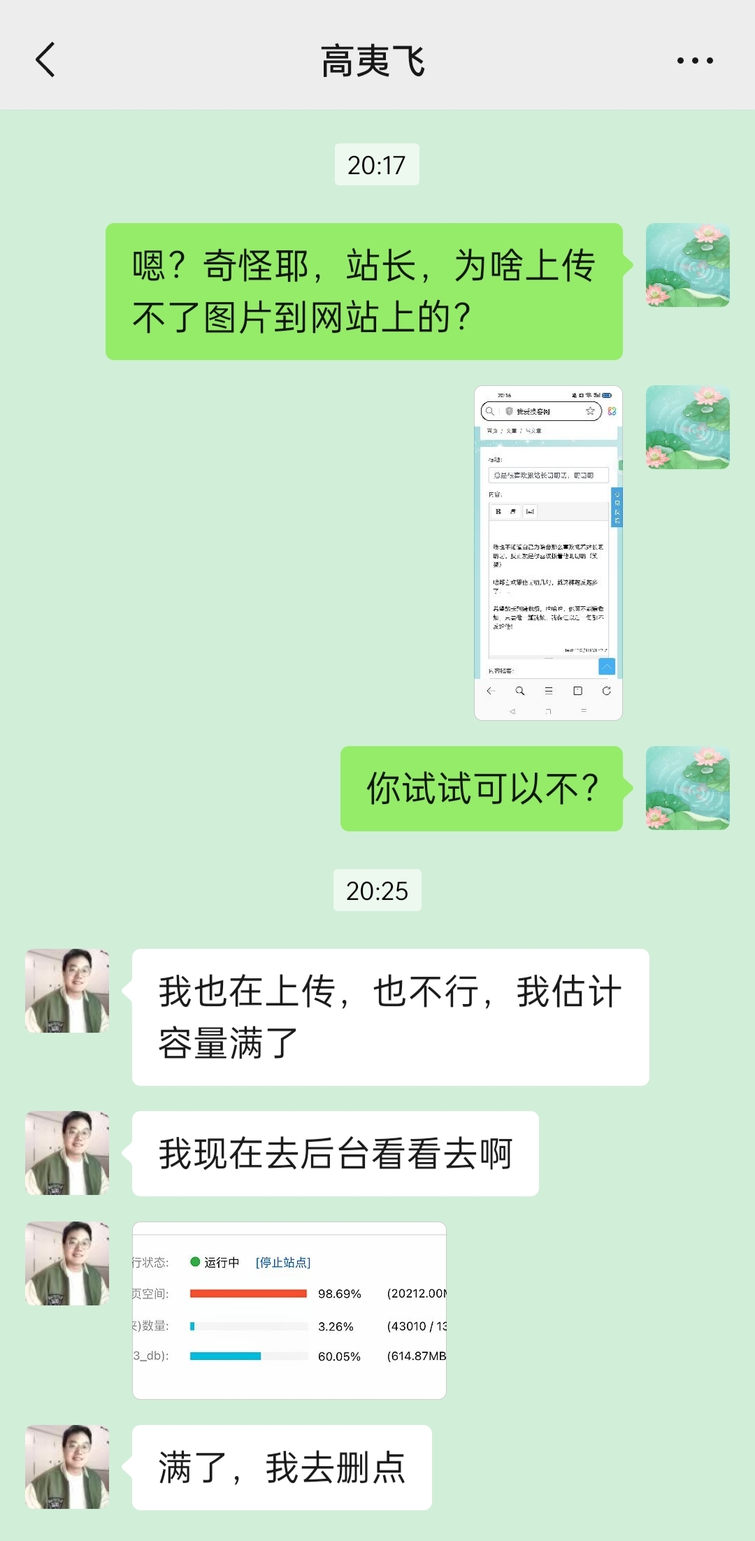 今晚我把朋友圈的内容复制粘贴到网站上更新,发现图片上传不了,于是就去跟站长说了。站长当时估计不怎么忙,他很快就回我了。他说容量满了,把之前存在服务器的文件删一些,就可以上传了。