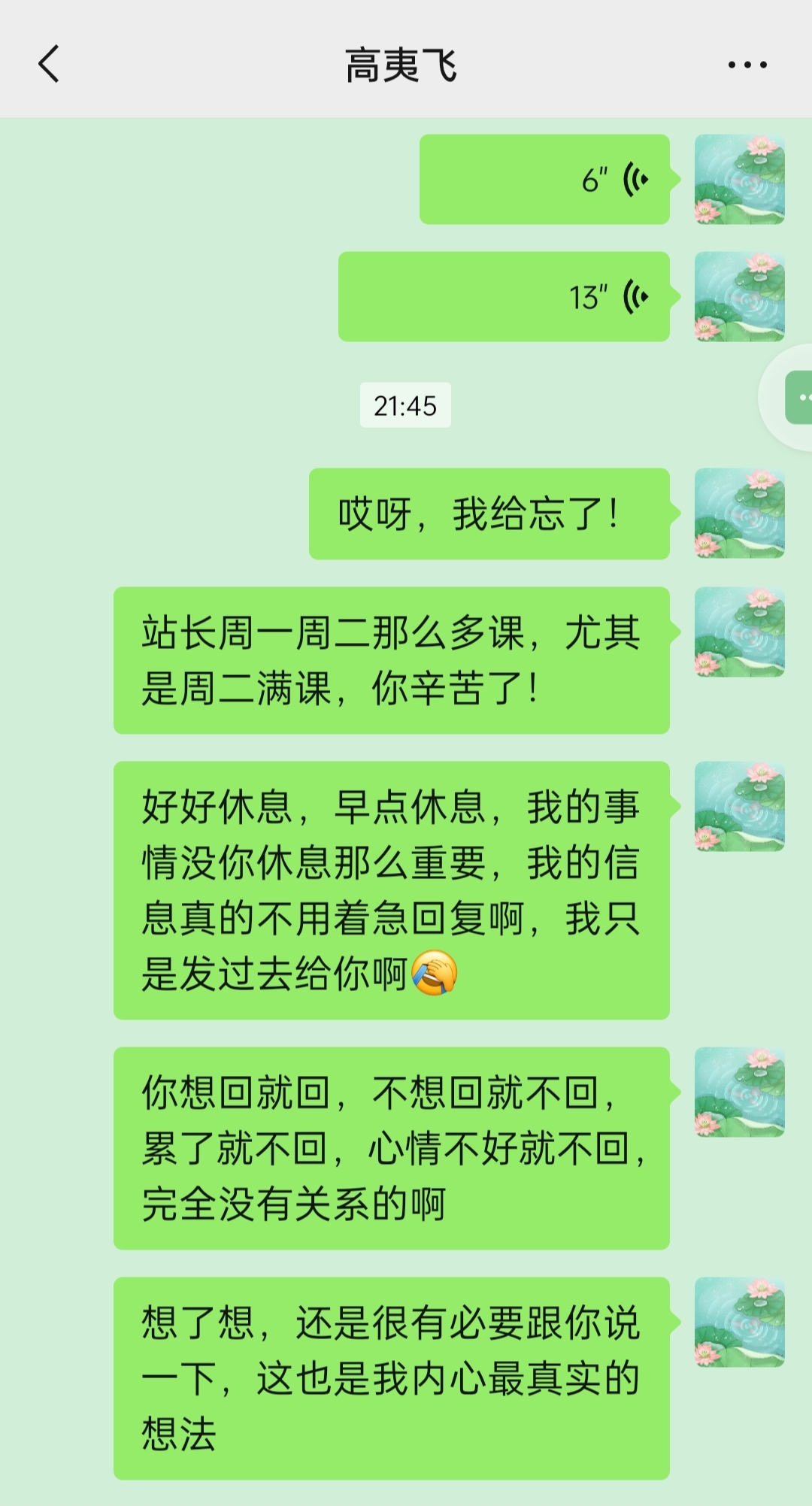 讲真的,我也没想到他会这么快回我,这么快帮我解决问题。因为我记得他10月份跟我说过的话,他说周一周二很多课,尤其是周二满课,他很累,他感觉他嗓子都哑了。