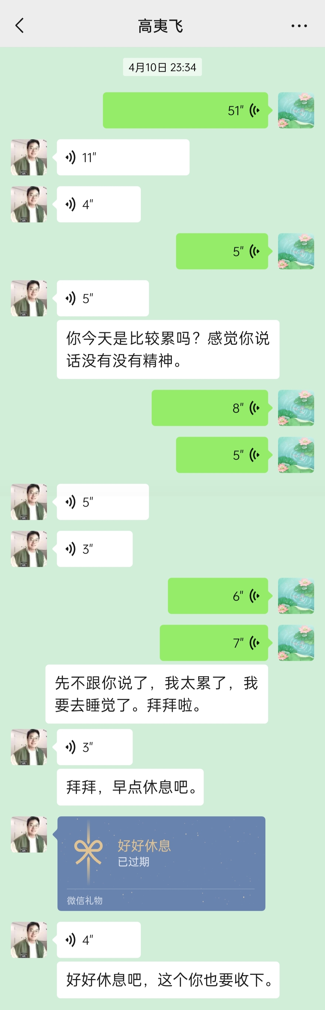 我很心疼他,我也不想他那么累,更不想他那么累还想着去回我的信息。我心里想着的全是“那么累就去休息吧,别说话了,休息休息”。他发过来的语音真的很让人心疼,声音都沙哑了,还要说话,还要发语音。