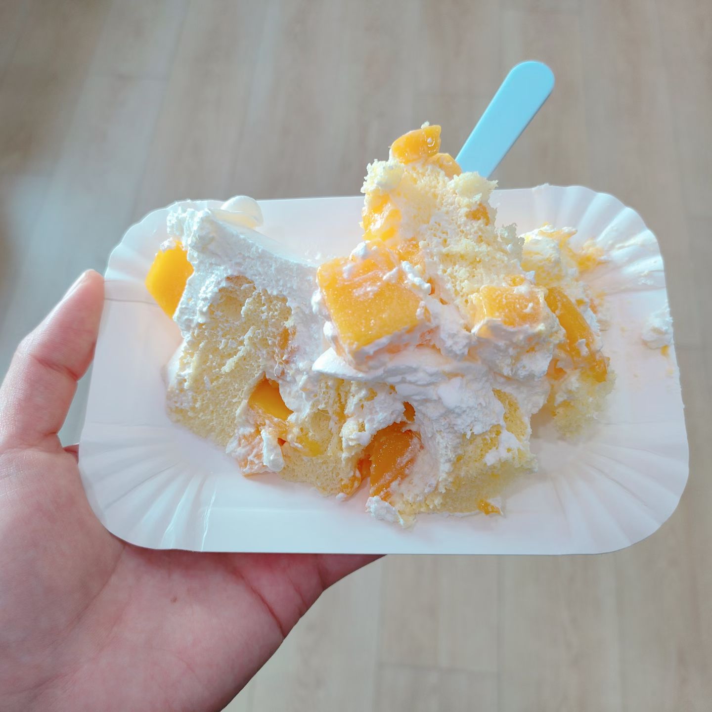 哇!今天有蛋糕吃!这蛋糕真好吃,奶油一点都不腻,蛋糕胚松松软软,芒果成熟度刚刚好,我吃了好大一块呢!