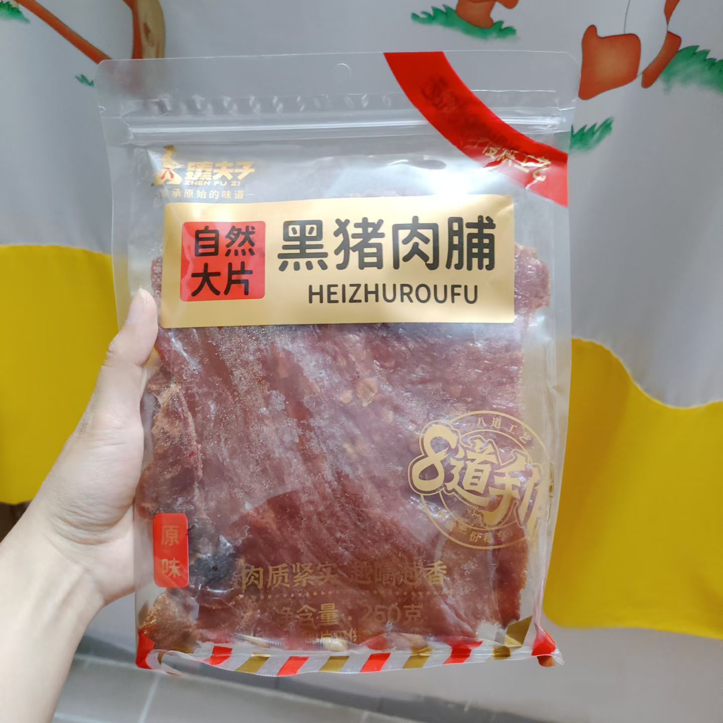这种猪肉干是一大块儿的,需要自己撕开来吃,超好吃!我多买了两包,一包给小姑,另一包给肖肖。