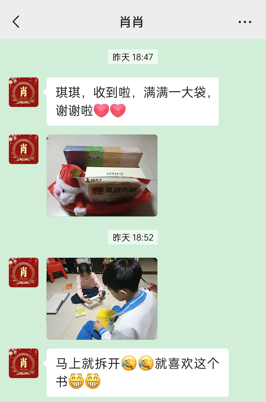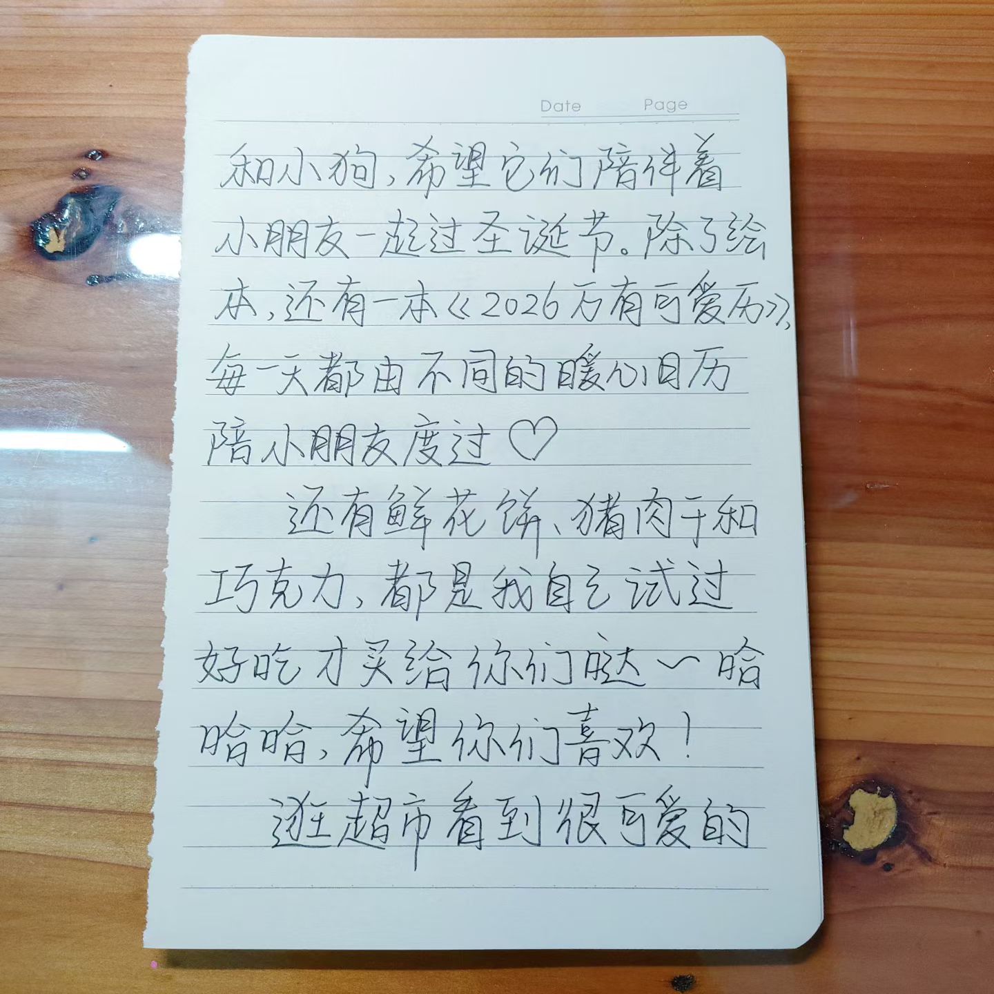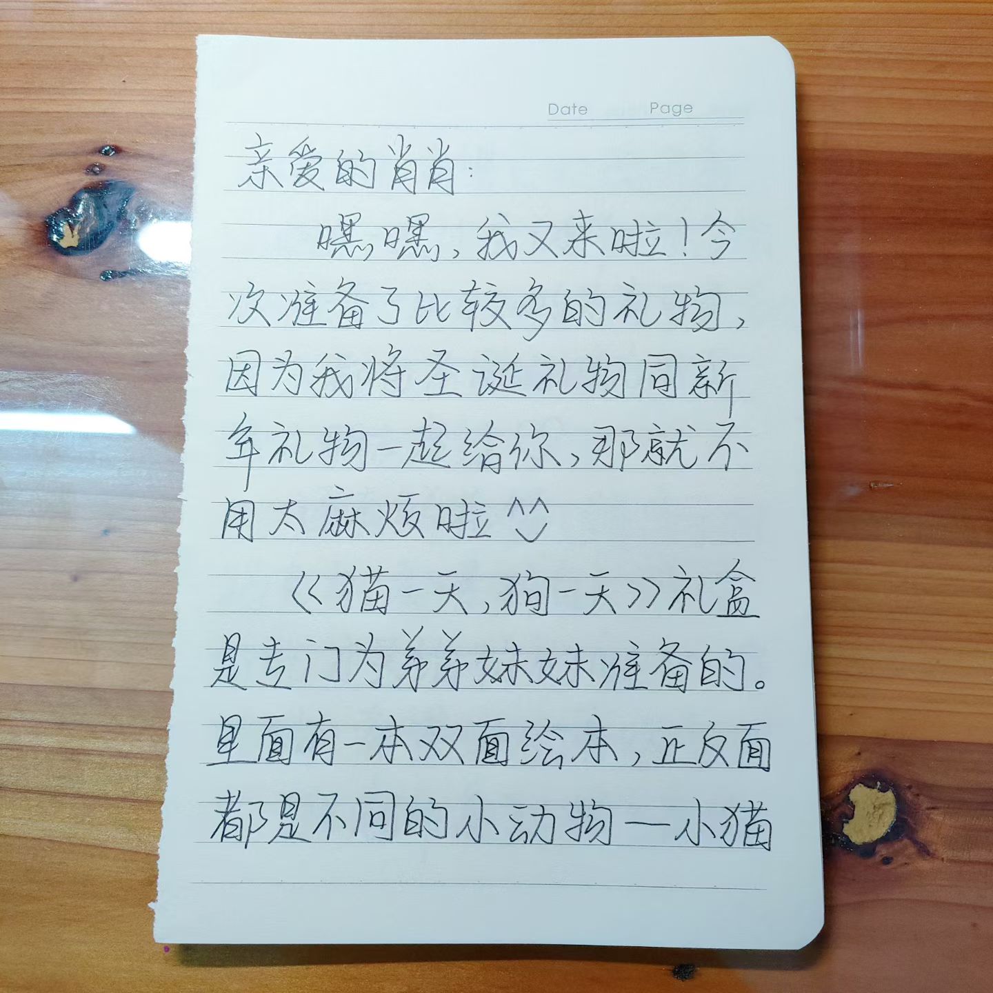 这一次,我给肖肖和她的儿女买了五份礼物:《猫一天 狗一天》礼盒、鲜花饼、巧克力、猪肉干和圣诞老人,哈哈哈,我还写了一封信呢!