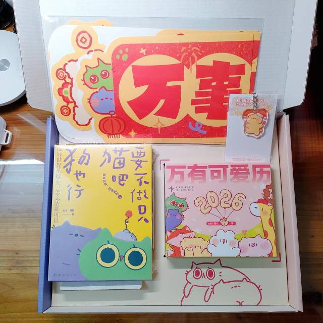 今年,我一共买了六份《猫一天,狗一天》礼盒,里面包含一本双面绘本,还有一本《2026万有可爱历》