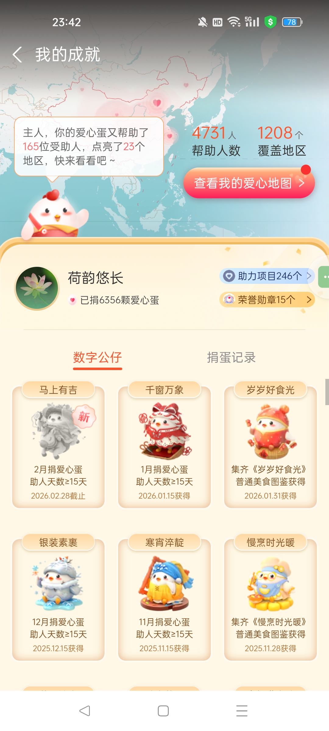 原来从2018年11月25日到2026年2月6日,我已经累计捐赠了6319颗爱心蛋,帮助了4731人,覆盖1208个地区了。