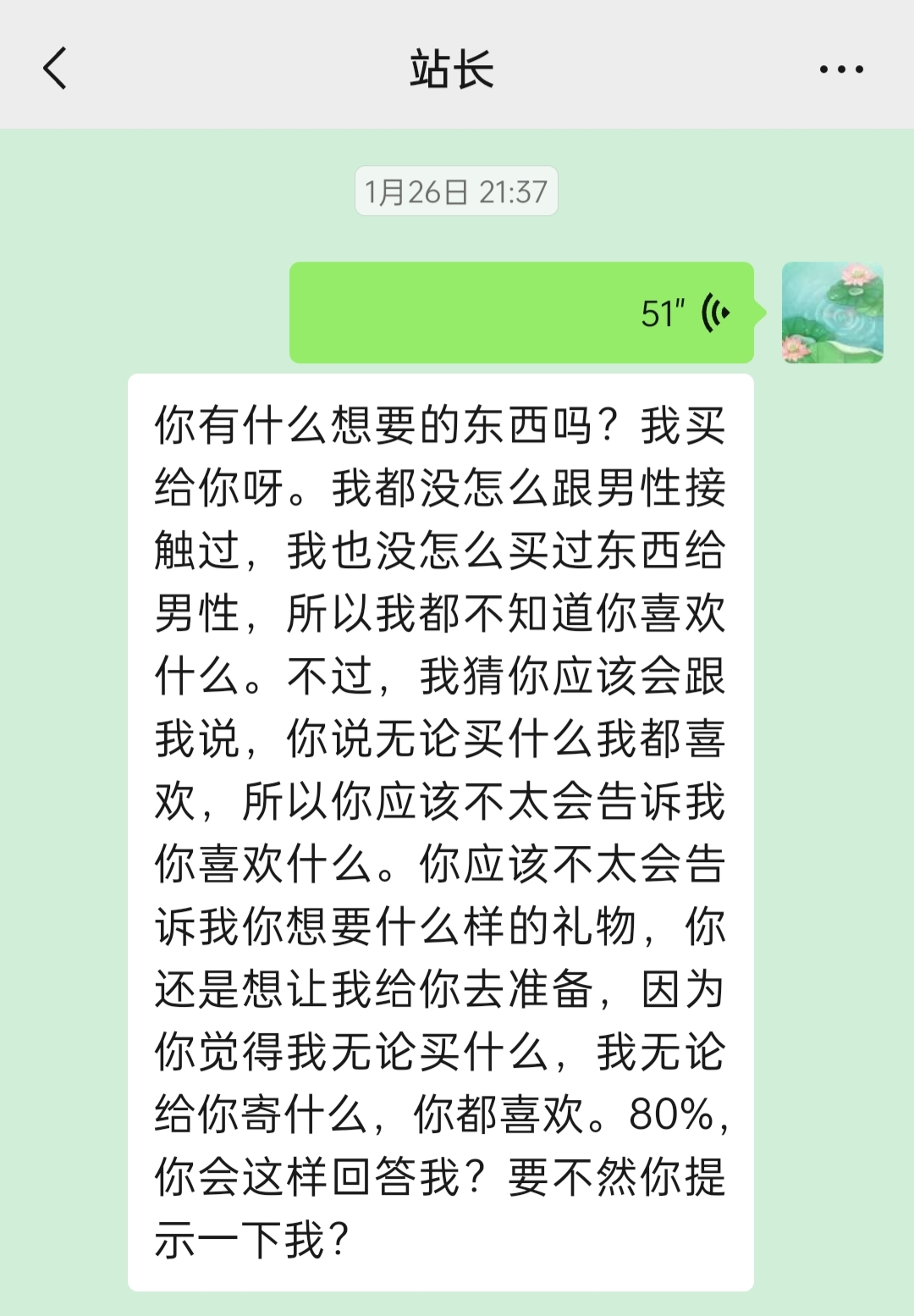 前些日子我问站长,你生日想要啥礼物啊?我买给你啊。我平常也很少跟男性接触,不太知道男性喜欢啥,你不妨提示一下我呗~
