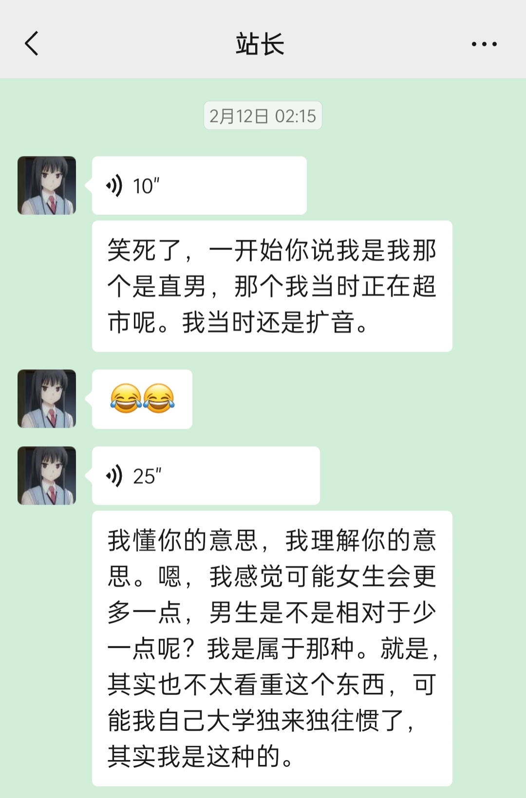 站长还有个更搞笑的地方,那天他在逛超市了一边逛一边听我的语音,他听的第一句刚好就是我说他直男那句(笑哭)。好家伙,他开的还是扩音!