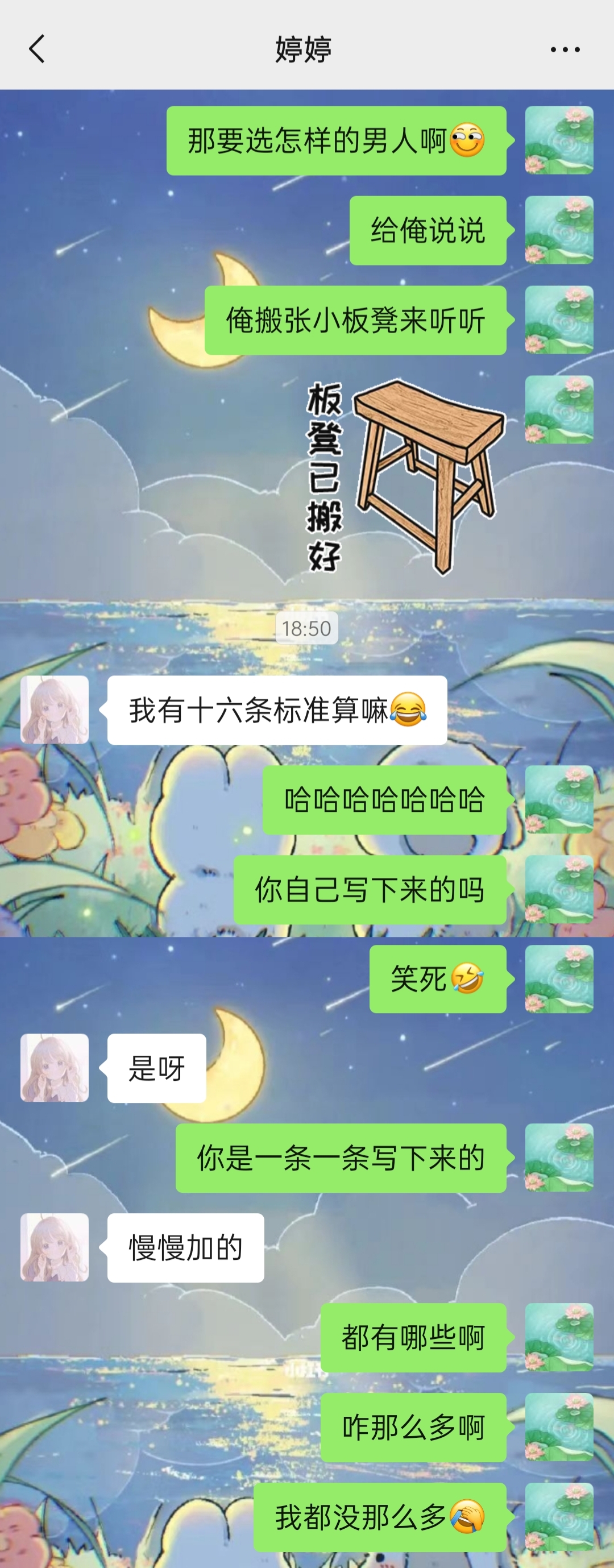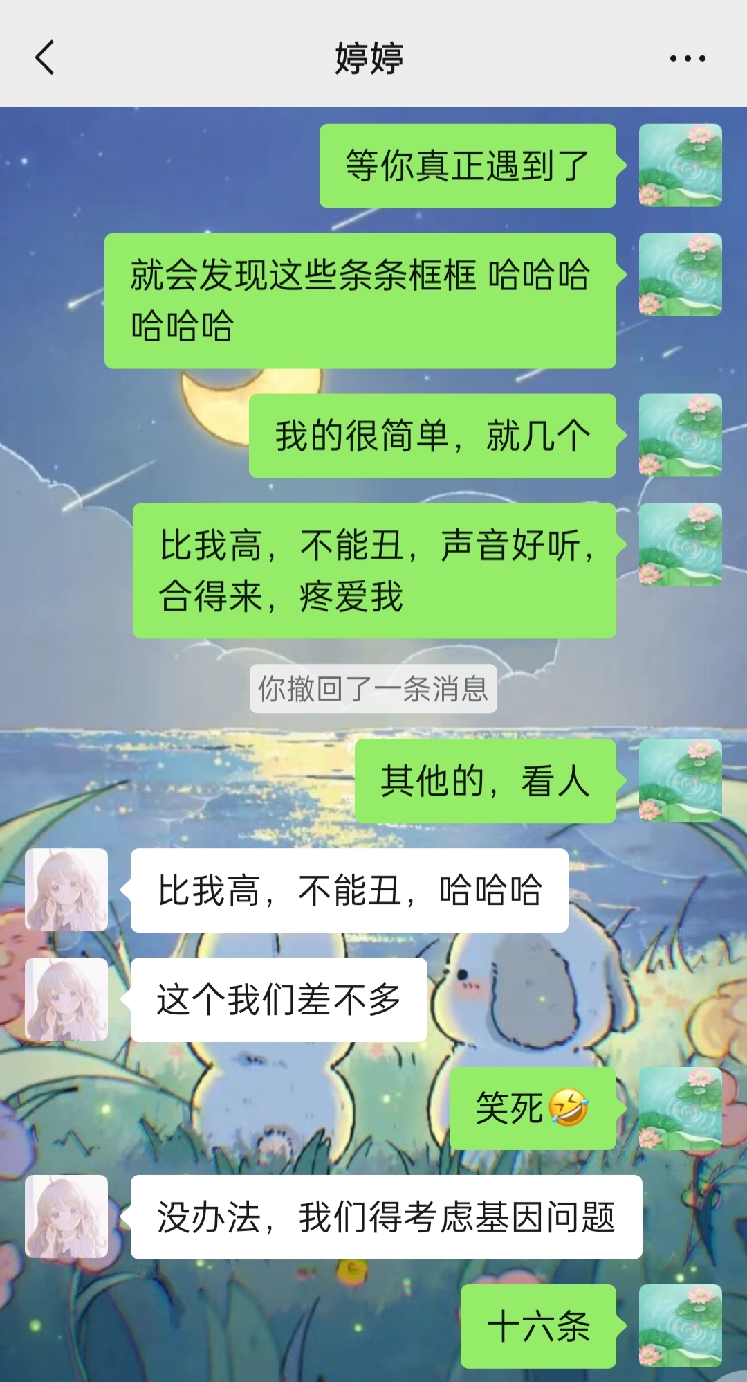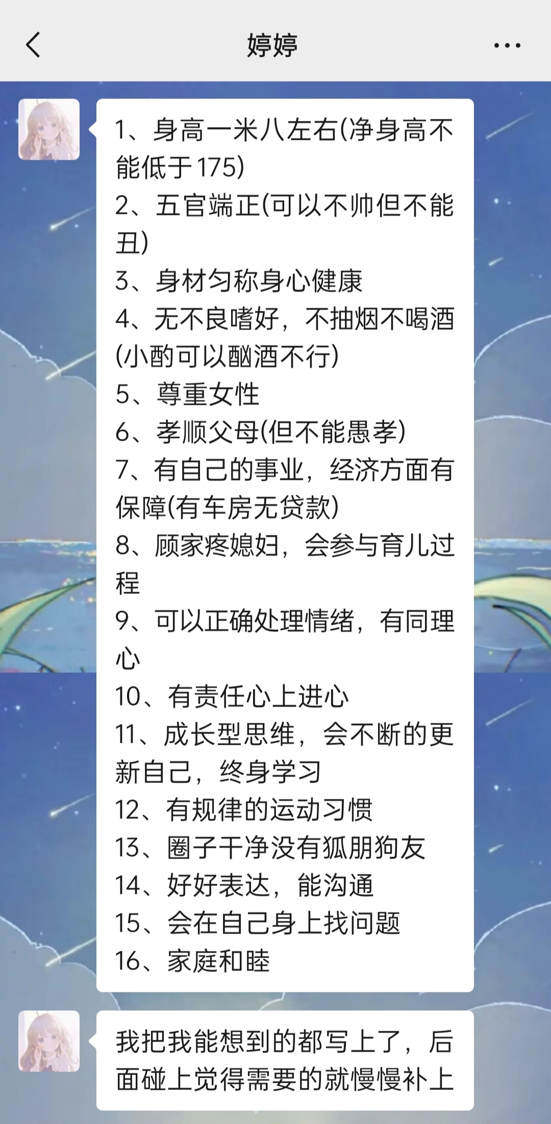 好家伙!笑死我了,哈哈哈哈哈哈!十六条!我还以为她写几个就得了,谁知道噼里啪啦给我打来 十六条选男人的标准(笑哭)