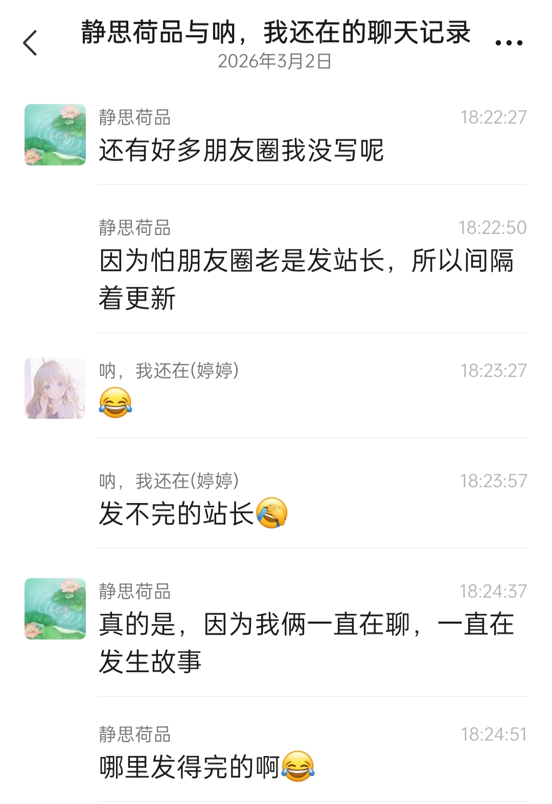 是真的发不完啊,哈哈哈哈哈哈哈,我本来就很喜欢记录生活,再加上我和站长都很好玩,我们两个也一直在聊,一直在发生着故事,所以怎么可能发得完嘛(笑哭)