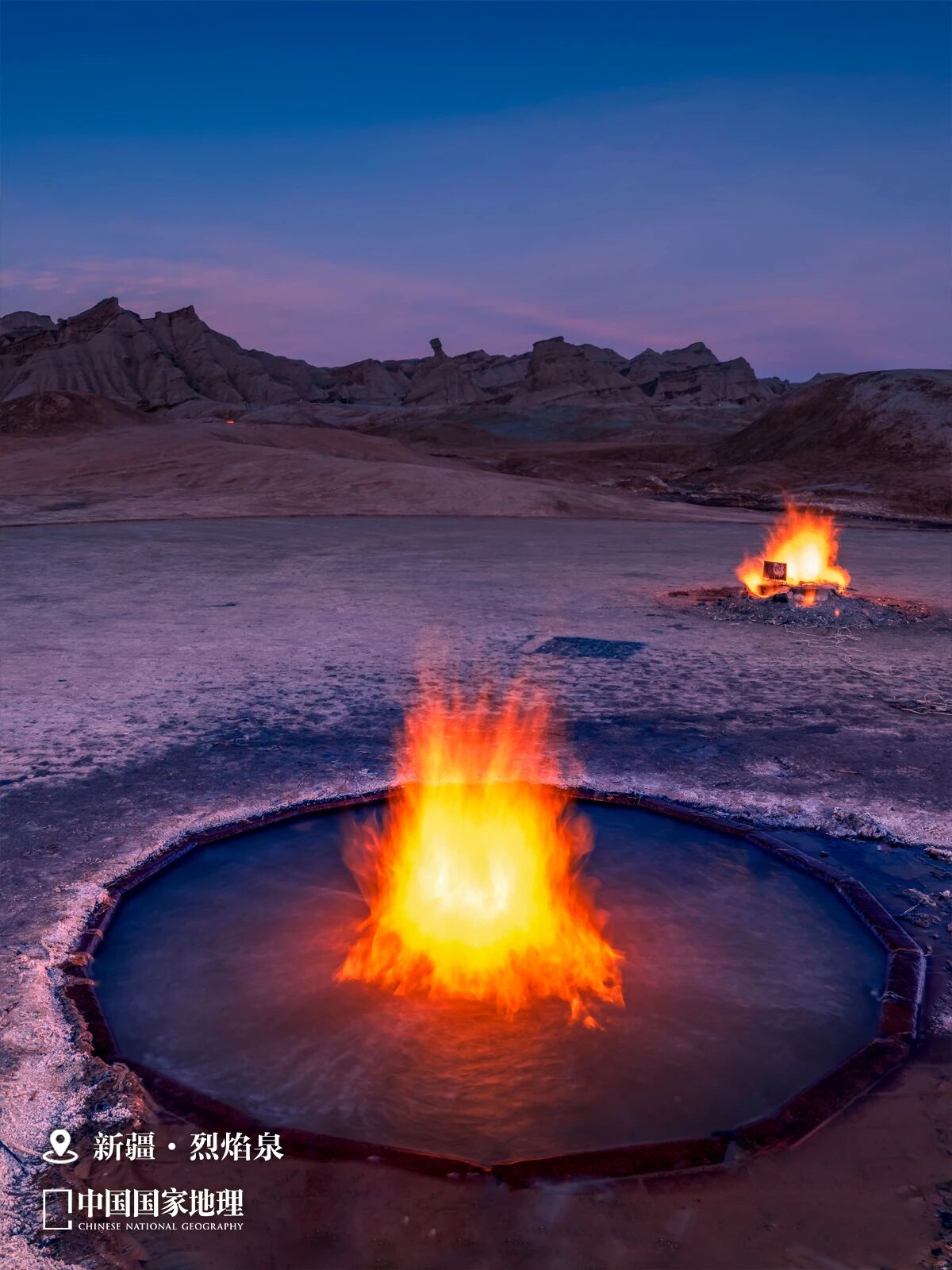 图① 新疆阿克苏地区拜城县克孜尔乡烈焰泉,此处水火共生,地下富有天然气,沿裂隙上升可从泉水附近排出,遇火即燃。