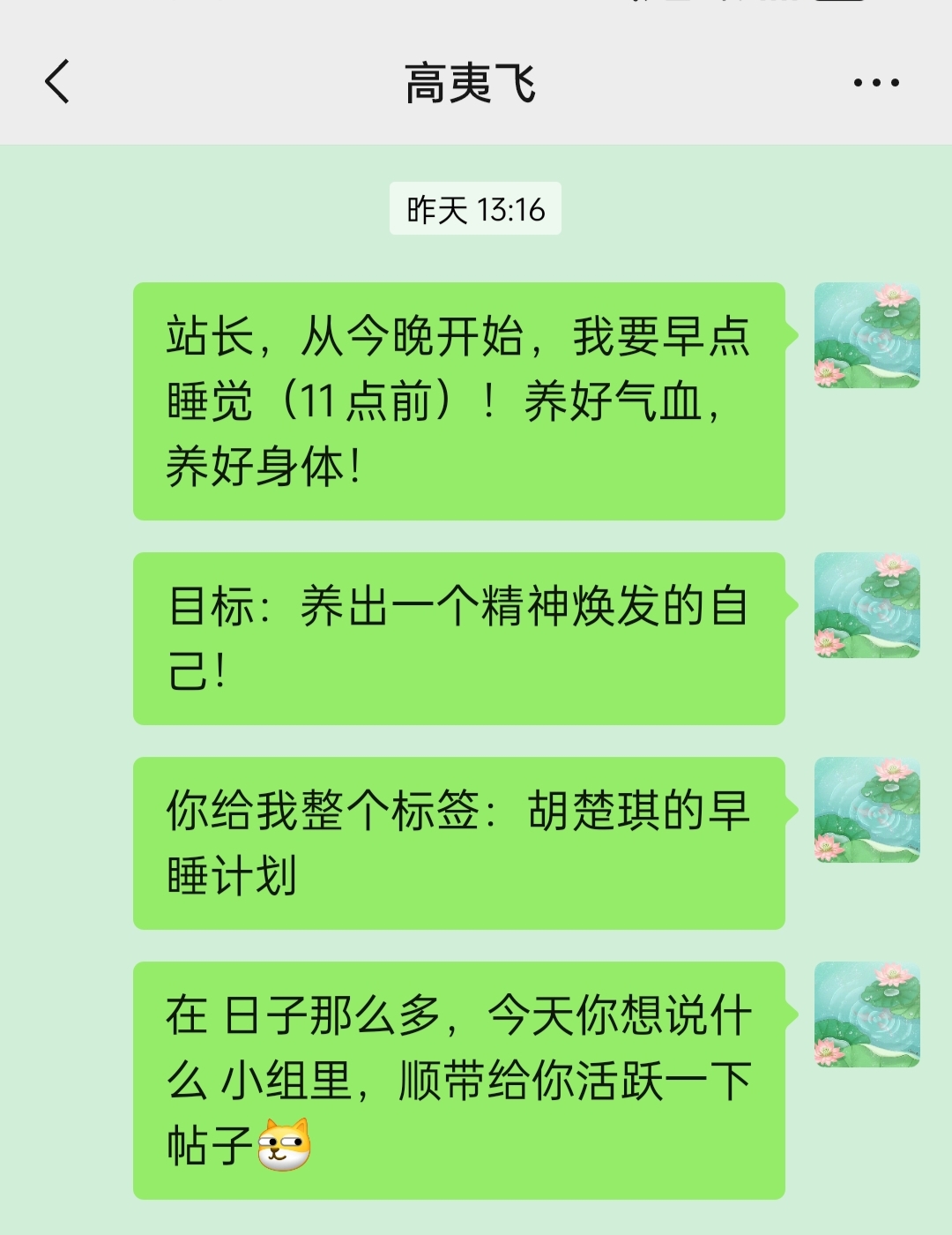昨天,我跟站长说,你给我在“日子那么多 今天你想说什么”小组里整一个标签“胡楚琪的早睡计划”,我准备要开始早睡养身体了,养出一个精神焕发的自己!顺带给你活跃一下帖子!