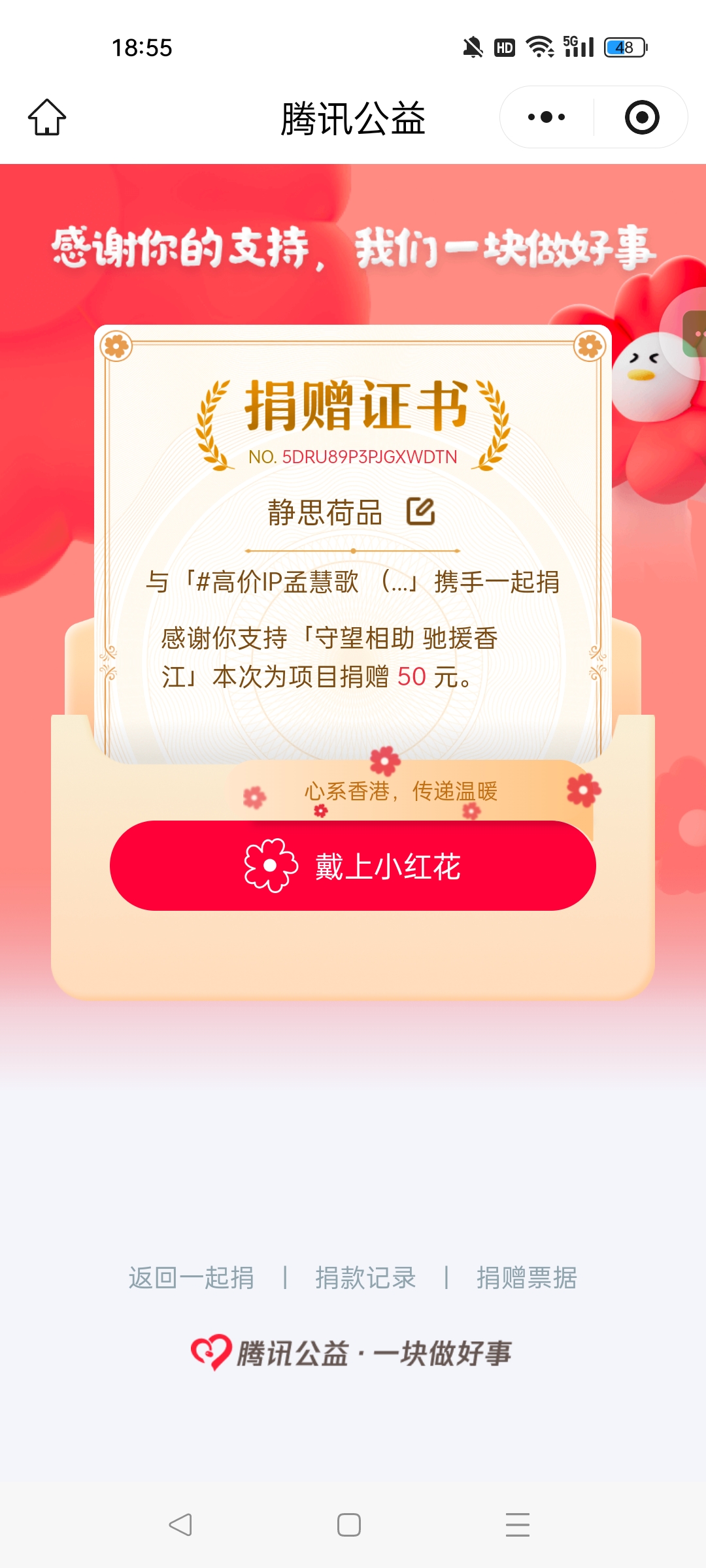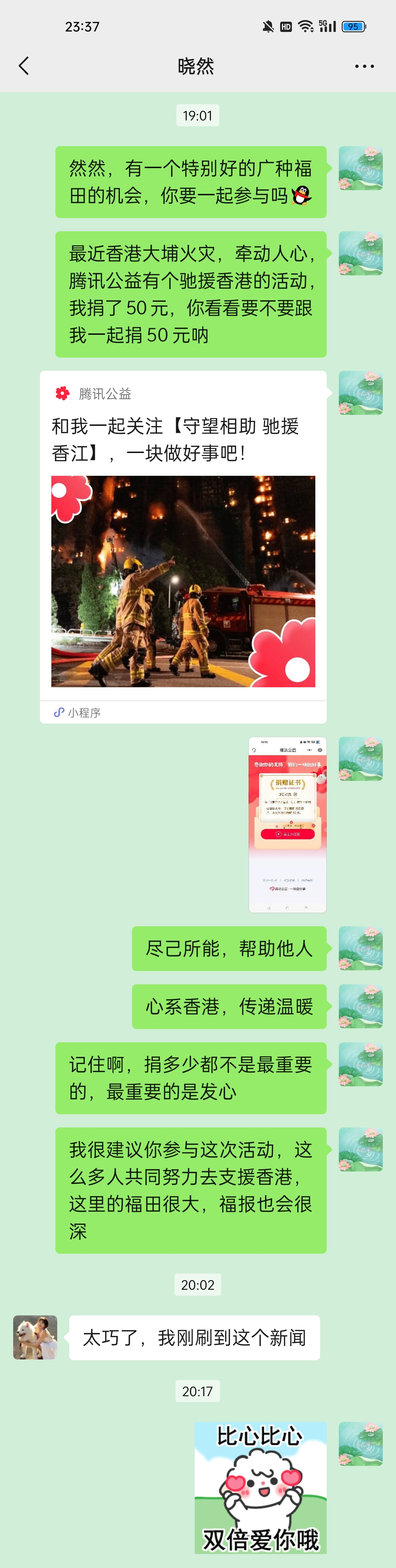 最近香港大埔火灾,牵动人心,我捐了50元给受灾群众