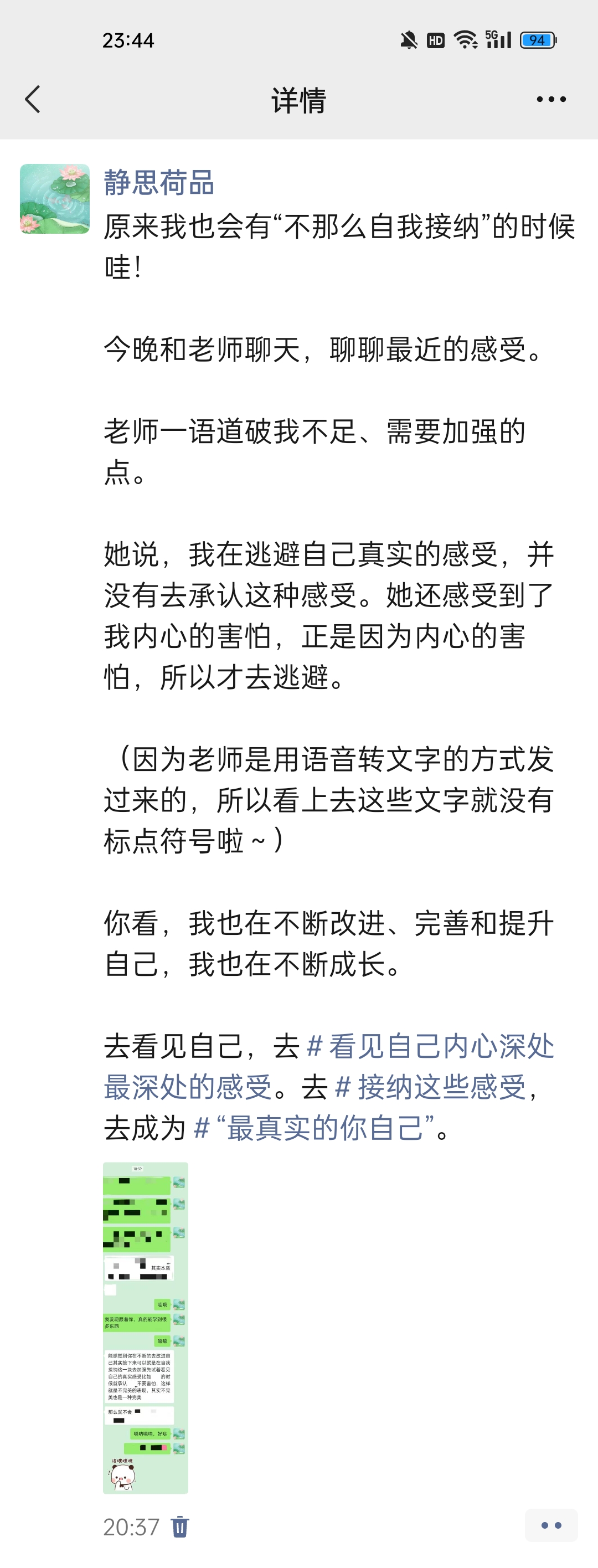 跟老师聊了聊天,老师一语道破我没有做到自我接纳,她让我看见自己内心最真实的感受,去接纳自己,这也是一种成长