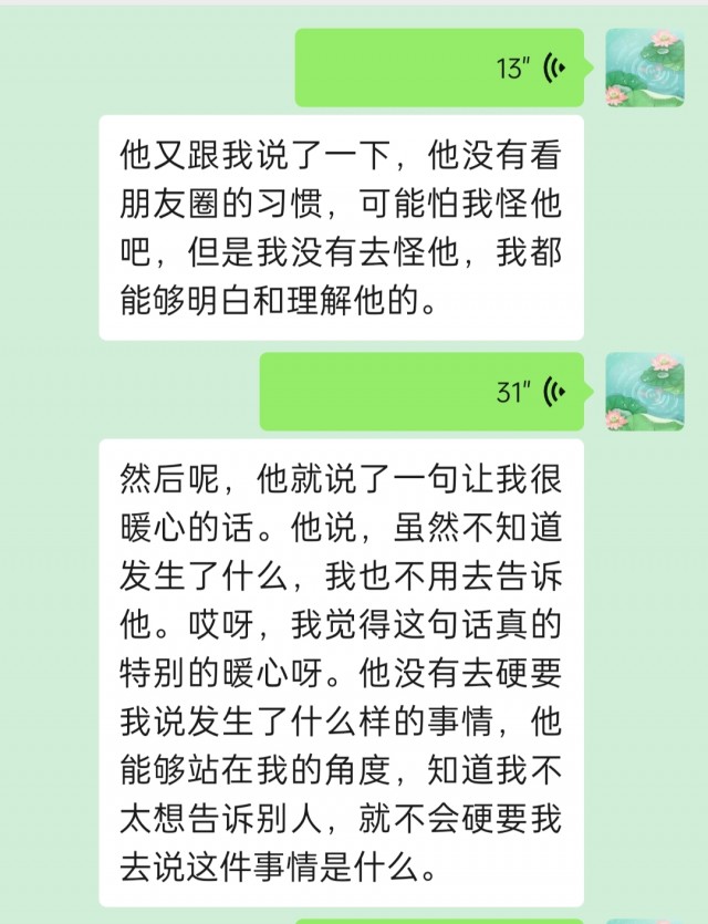 “虽然说不知道你发生了什么,你也不用告诉我,但是我感觉你肯定能逢凶化吉。”昨晚十一点多,站长给我发来三句语音。当我听到他这样跟我说的时候,我的内心被触动了一下,感到特别暖心。因为今次发生的这件事情比较严重,我确实不太愿意跟朋友们去说。他没有硬要我去说发生了什么事情,而是选择站在我的角度,跟我说“虽然说不知道你发生了什么,你也不用告诉我”,哇,我的天!他真的挺好的,他真的有体谅我和理解我啊!