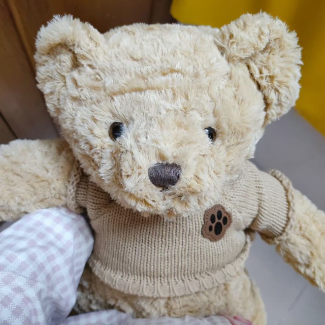 来吧,小熊,跟大家打声招呼~“嗨,大家好呀,我是胡楚琪的小熊,今晚第一次和主人睡觉,心情有些激动呢!”