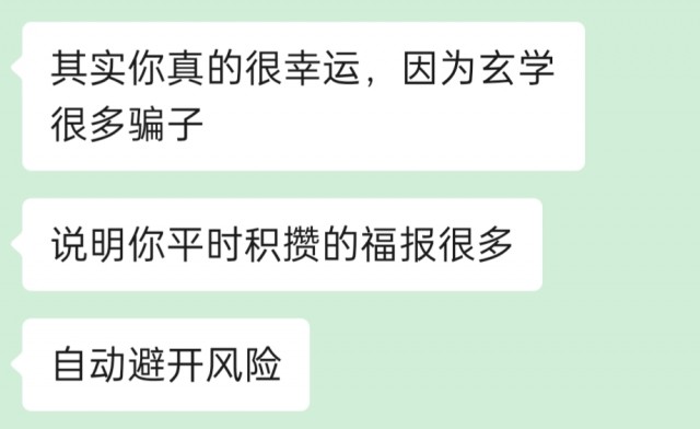今天,朋友跟我说,“其实你真的很幸运,因为玄学很多骗子。说明你平时积攒的福报很多,自动避开风险。”是啊,我真的很幸运。昨晚我爸还跟我说,“你很幸运的,这一路上遇到的都是贵人。”