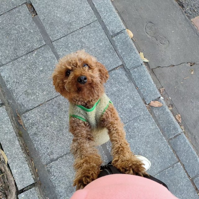 在街上走着,看见一只小狗,叫了它一声“狗狗”,小狗摇着尾巴向我走过来。你看,它好热情,还想让我抱抱它,摸摸它来着~