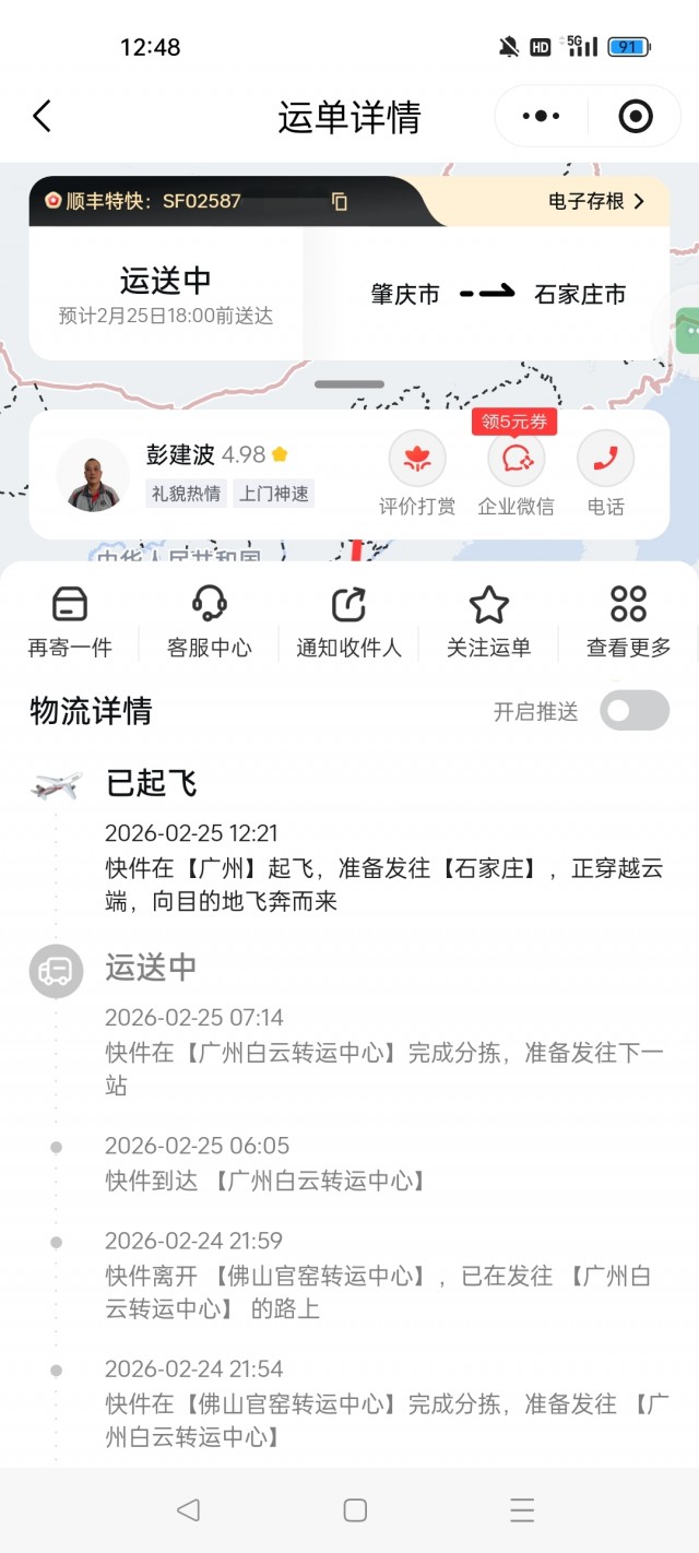 “快件在广州起飞,准备发往石家庄,正穿越...